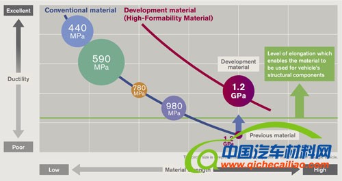 图中绿色水平线为:汽车制造中材料所需柔韧性最低标准。普通材料要达到1.2GPa的强度,柔韧性就会不足,无法应用于汽车制造中