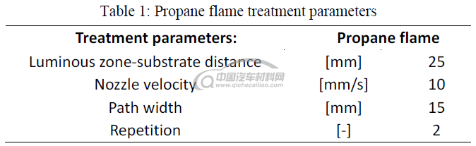PA66样品在粘合区域用丙烷火炬(PRI2000D,Primus)进行火焰处理。先调节火焰以使主反应区(发光区)最大化,即火焰的最热和强氧化区域。虽然整体火焰长度保持恒定在50mm,发光区域为15mm,但发光区域和样品之间的距离以10mm步长从5mm变为45mm,以便最大化处理效率。结果表明,发光区域的尖端到基板距离为25mm可最有效地修饰PA66表面,平均接触角为22.4°。火焰距离较近会导致基板的热降解,将距离增加到45 mm时,富氧区域与PA66表面脱离接触,导致接触角(54.2°)突然增加。表1列出了在火焰处理期间使用的工艺参数。