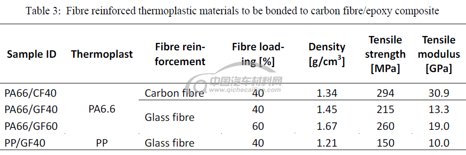 选用三种不同的长纤维增强热塑性材料作为PA66模塑材料板,用40%和60%玻璃纤维(PA66 / GF40,PA66 / GF60)和40%碳纤维(PA66 / CF40)增强,聚丙烯样品填充40%玻璃纤维(PP / GF40)。表3中显示了各种纤维增强基材的材料特性的简要概述。碳纤维增强环氧树脂样品由碳纤维非卷曲织物和环氧树脂(HexionTM RIM 935 / RIMH 936)制成,带有剥离层表面用于改善粘接性能。
