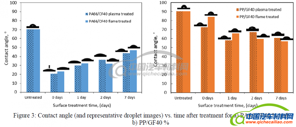 处理后的时间和相关水滴图像的接触角如下图3。在图3a)中,PA66 / CF40%情景的火焰和等离子体处理结果随时间变化。结果表明,表面处理后接触角从约70°到约20°显著下降。接下来随着时间的推移,接触角逐步增加,这表明表面功能性降低。但是PP / CF40%是一个例外,其接触角在处理后仅从90°减少至72-84°(图3b)。这种现象可能是由聚合物熔化导致物理粗糙和纤维暴露在基板表面上而引起的。一天后,接触角再次小幅下降,但表面极性几乎保持不变。对于所有材料,与使用丙烷火炬相比,等离子体处理通常会得到更小的接触角。