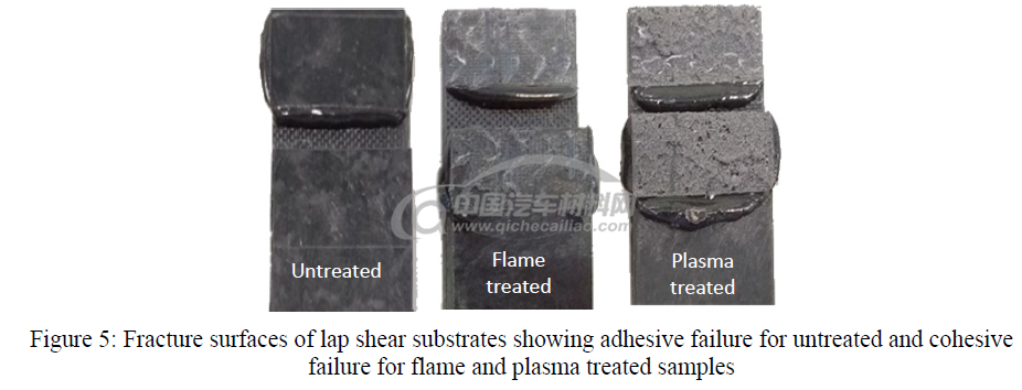 例如,丙烷火焰和等离子体处理的PA66/CF40%搭接剪切样品的破坏和破裂表面在图5中进行比较。未经处理的搭接剪切样品在热塑性表面上没有任何粘合剂失效。丙烷火焰处理的样品在21N/mm2强度下从CF/环氧基材上剥离。等离子体处理的样品在约25N/mm2强度下在粘合剂内失效。这主要是等离子体处理比丙烷火焰处理可以更有效地沉积官能团,胶粘剂与树脂具有良好相互作用的极性官能团,则将具有更高的表面极性,因此等离子体处理的基材具有低接触角。