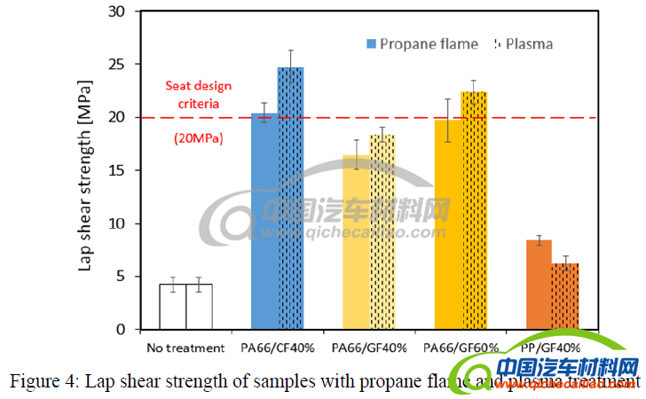 虽然两种表面处理方法导致座椅内外部材料之间的粘合强度增加300-400%,但是等离子体表面改性效果更佳。测试过程中发现,填充有40%CF和60%GF的经等离子体处理的PA66满足> 20MPa剪切强度的座椅设计标准。较高的玻璃纤维含量(60%与40%相比)可提供更好的与粘合剂的机械互锁,从而改善粘合性。