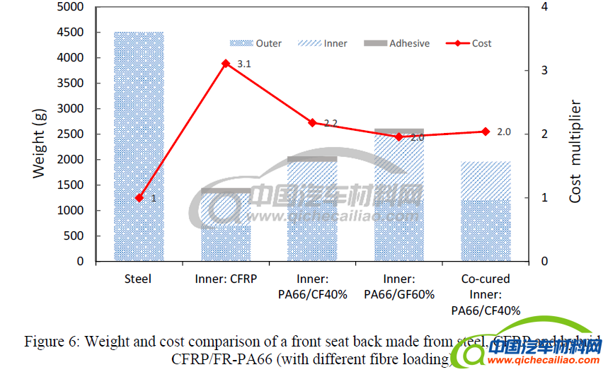 第一代CFRP(2件式)和第二代2件式混合CFRP/纤维增强PA66复合材料座椅靠背的结构重量和成本与原钢制座椅的对比如图6所示。多材料混合座椅靠背与树脂传递模塑CFRP座椅靠背相比,可降低成本约30%。碳纤维的使用保证了结构强度,玻璃纤维的混合应用也降低了结构成本,同时,还具有轻量化的优势。未来,若实现复合材料同步固化成型的接合方式则可以消除粘合剂的使用,进一步减少重量,降低材料成本。