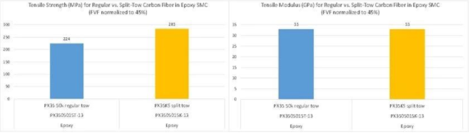 以SMC系统常用的树脂为例,这款碳纤维丝束新品已经与乙烯基树脂、环氧树脂和聚氨酯配合使用并进行了性能测试。之所以没有把不饱和聚酯树脂纳入考量,是因为碳纤维的介入为其预设了高温应用环境/出色机械性能的门槛。在这三种惯用树脂中,乙烯基树脂配方可分为含苯乙烯、低苯乙烯和无苯乙烯三类,均被归为溶剂型系统,与热熔型系统相对应。就上述三种树脂系统而言,当与PX35 KS配合使用时,任意一种都实现了分散均匀性的显著提升。