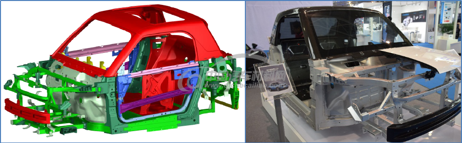 ▼ 铝合金框架式轻量化车身:集成了多种铝成型工艺,较钢制车身减重30%以上
