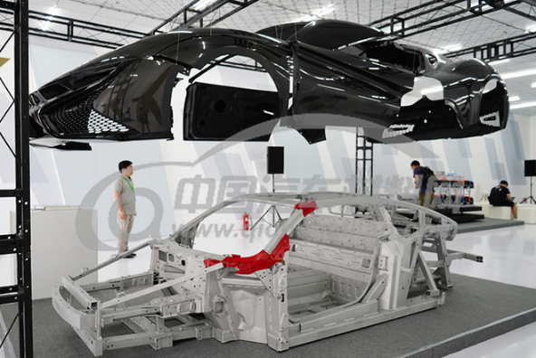 整车外观可见部分,除了前后保险杠、侧裙等易损部件之外,其他车身覆盖件全部采用碳纤维材质。车身外覆盖件28个零件仅重48kg,比传统钢板材料车身减重45%以上,比铝合金材料车身减重20%。