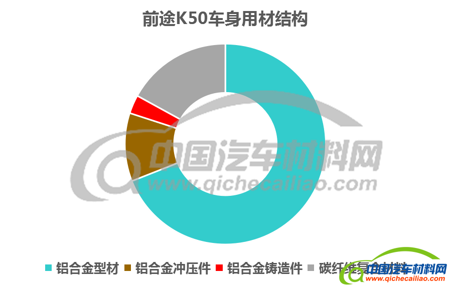 车身骨架采用铝合金挤压型材,通过在型材内部一次挤压成型加强结构替代传统汽车的加强板,降低重量,减少单件的加工工序以及总成的焊接工序,提高装配效率,减少总的制造成本。前途K50的全铝车身框架作为主承力结构,保证车身性能的同时,比传统钢制车身框架减重约30%。
