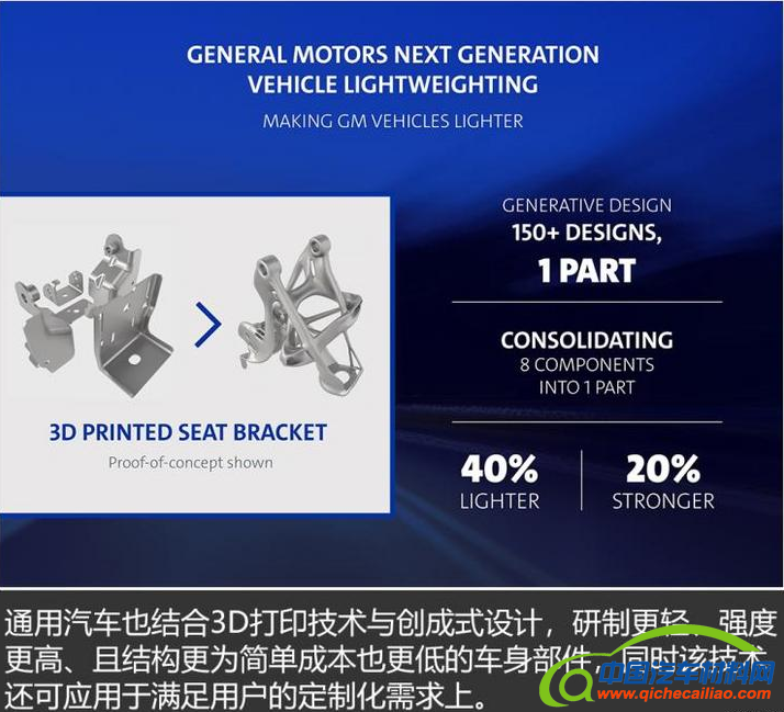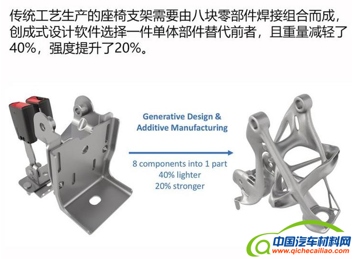 无独有偶,通用汽车在汽车零部件的设计上也采用了相似的技术,通过传统3D打印技术与创成式设计相结合,设计全新的汽车部件以满足更高的车辆性能需求和客户个性化需求。