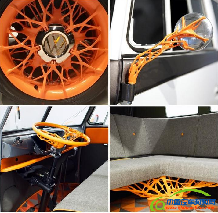 就在7月初,大众汽车在其位于加州硅谷的创新与工程中心(IECC)展示了一台采用电力驱动并应用了轻量化设计的Type 20 Microbus概念车,在这台造型复古的电动概念车上,人们惊奇的发现轮圈、方向盘、座椅支架、外后视镜支架等零部件的造型和颜色看上去相当诡异。原来,这些零部件正是采用了创成式设计(Generative Design)生产出来的轻量化产品。