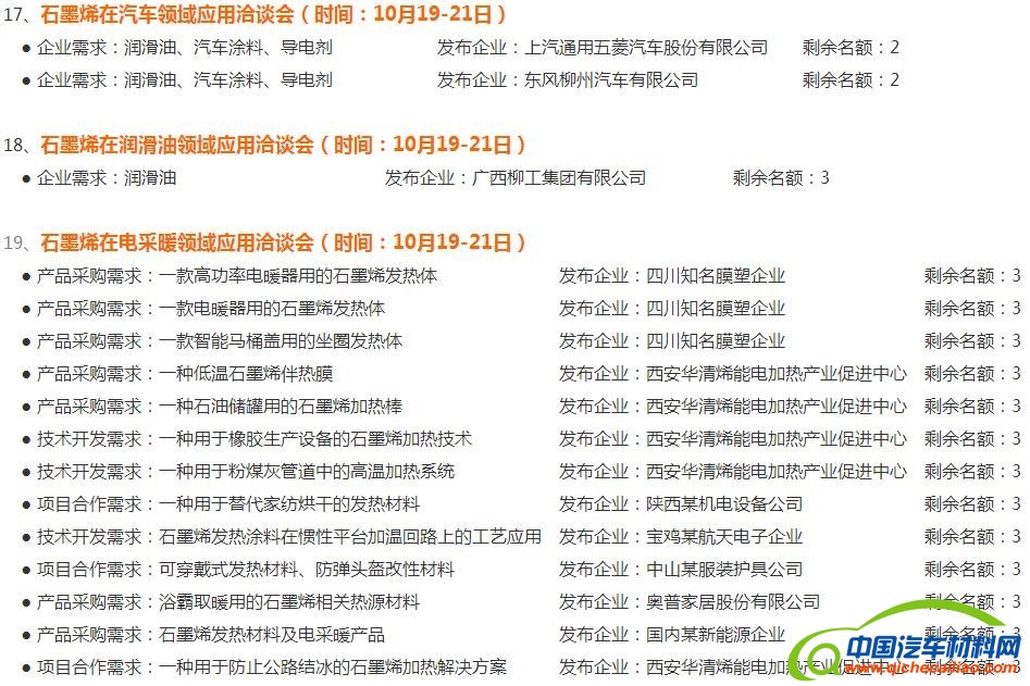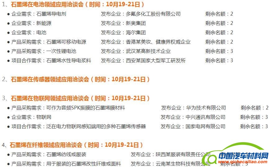为精准对接石墨烯应用,解决终端应用企业需求痛点,推动终端产品不断创新以及石墨烯商业化进程,“2019中国国际石墨烯创新大会”将设立“商务会客室”邀请华为、陕汽、塔塔钢铁......500强企业携200+需求做客“商务会客室”与全球石墨烯产业化企业“零距离”对接石墨烯技术和产品需求!为应用企业带来亟需的石墨烯相关技术和产品,助力其赢得战略先机、促进产业转型升级、实现新的产业增长点,同时也将为石墨烯企业拓展产品市场,把脉企业未来发展方向,推动石墨烯产业化进程,开启全球石墨烯产业发展新时代!