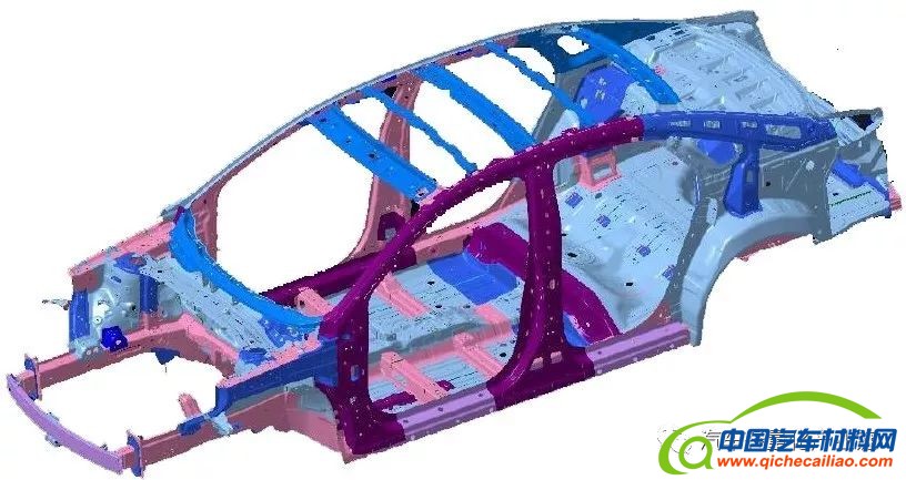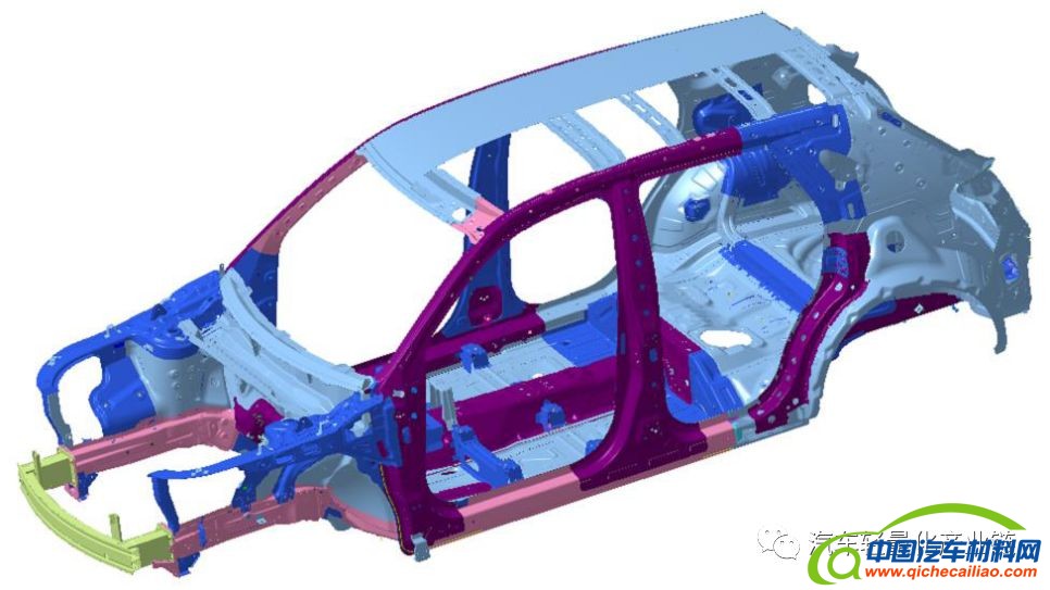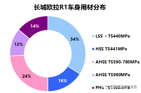 长城欧拉R1是一款定位于城市通勤的纯电动小车,整车尺寸为长3495*宽1660*高1560mm,轴距为2475mm。电池容量为33kwh,最大功率35kw,续航里程达到351km。车型整备质量为990kg,扭转刚度为15152N∙m/°,轻量化系数为3.2。车身骨架高强钢应用比例达66%,在吸能区选用DP钢、HSLA钢,乘员区选择1500MPa热成形钢、980MPa超高强钢。翼子板应用集成式不等厚热塑性塑料进一步减重。此外,对发盖、顶盖横梁、减震器、B柱内板、底板横/纵梁等进行了大量的拓扑优化、锯齿边设计优化等结构优化。欧拉R1车身用材如下: