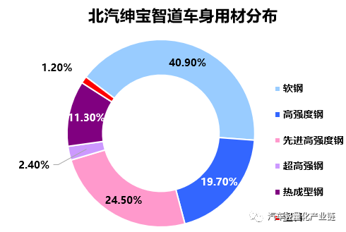 北汽绅宝智道定位为AI智能家轿,整车尺寸为长4785*宽1835*高1490mm,轴距为2780mm。白车身重302.1kg,静态扭转刚度为26454N∙m/deg,轻量化系数为2.61。车身采用了19个热成型钢部件,超高强钢应用比例也达到了2.4%。对前、后纵梁,前、后减震塔,前地板座椅横梁等进行结构优化,实现减重的同时提升了刚度和安全性。北汽绅宝智道车身用材如下: