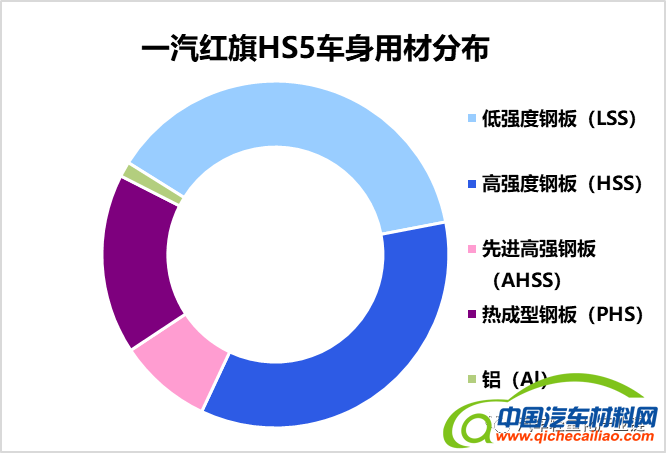 HS5是红旗品牌首款豪华B级SUV,整车尺寸为长4760mm*宽1907mm*高1700mm,轴距为2870mm。白车身重333kg,扭转刚度为25905Nm/°,轻量化系数为2.75。高强度钢应用比例超过60%,极致的被动安全同时实现轻量化。同时,塑料前端模块、铝合金前防撞梁的设计也进一步有效减重。红旗HS5车身用材如下: