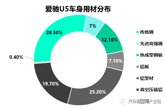 爱驰U5是爱驰基于MAS平台打造的首款量产车,作为一款纯电动A+级SUV,U5车型尺寸为长4680mm、宽1880mm、高1680mm,轴距为2800mm。独创的专利技术“三明治”电池包容量为63kWh,密度达到170wh/kg,NEDC最大续航为503km+120km。爱驰U5车身轻量化系数为2.29,采用“上钢下铝”结构设计。全车共采用21个热成形零件,A柱、B柱以及车顶纵梁均采用了1500MPa热成形钢,车门防撞梁更是创新地采用了2000MPa热成形钢。挤压铝合金前碰撞横梁、一体铸造式铝合金减震塔、真空压铸铝合金横梁和纵梁、塑料翼子板等轻质材料的应用进一步实现轻量化。爱驰U5车身用材如下: