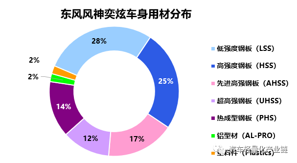 东风风神奕炫是基于东风与PSA联合开发的CMP平台打造的国内首发车型,整车尺寸为长4640*宽1800*高1470mm,轴距为2660mm。白车身重量为285.6kg,扭转刚度为21591N∙m/deg,轻量化系数为3.2。高强钢应用比例达到68%,并首次采用第三代高强钢TD1080。笼式车身结构采用了包括A/B柱、座椅横梁、边纵梁在内的18个热成型安全件,并开发了一种用于汽车减重的纵向变厚度薄板(TRB)。详细车身结构用材如下: