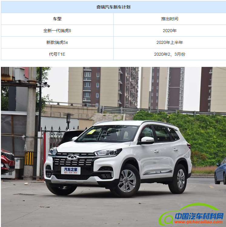 【中国汽车材料网】从官方获悉,奇瑞计划于2020年推出全新一代瑞虎8(参数|询价)车型,具体时间暂未确定。瑞虎5x也将推出改款车型,预计在明年上半年推出。此外,明年奇瑞还将推出一款内部代号为T1E的全新SUV车型产品,计划将在2020年二、三月份推出。