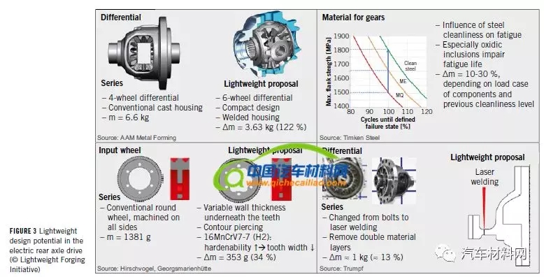 输入齿轮固定在差速器壳体的外侧,德西福格(Hirschvogel)提出的方案实现了在扭矩传递到牙齿较少的区域中牙根下面的材料节省。此外,通过在锻造过程中穿孔,产生轮廓钻孔,也可实现安装孔之间减轻重量。这里与连杆一样,采用提高淬透性的,且具有成本效益的表面硬化钢16MnCrV7-7(H2)1.8195,可以通过更高的齿轮强度进一步提高齿轮的承载能力。对于齿轮部件,Daido推荐使用其DCDG钢,其表现出高达40%的凹坑强度和20%的齿根疲劳强度,从而允许更小和更轻的尺寸。Timken Steel公司提出由ME级表面硬化钢制成的部件可承受使用超级钢时侧面上高达300 MPa的载荷。根据组件的负载状态,可以较少10%至30%的质量。输入齿轮一般使用多个螺纹紧固件连接到差速传动装置,Trumpf提出采用激光焊接,可节省1公斤的材料。