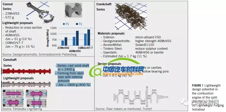 对于分轴式混合动力车,发动机系统的连杆一般由微合金钢3MnVS3制成,其抗拉强度为850MPa。目前,市场上也有应用新型微合金钢,抗拉强度可达到1160MPa,减少了轴的横截面,实现减重51克,但安全系数方面还有待提升。