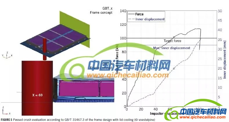 被动安全方面,图5显示了根据GB/T 31467.3标准的测试结果。结果显示,冷却系统的集成方式对电池包壳体机械性能影响较大,整个壳体的机械完整性直接受冷却系统的机械性能的影响。