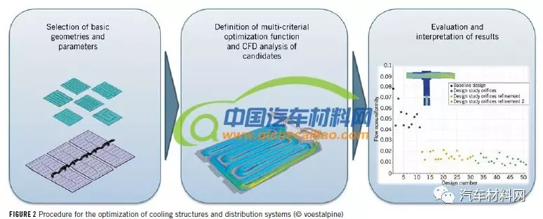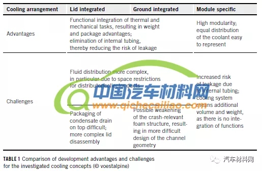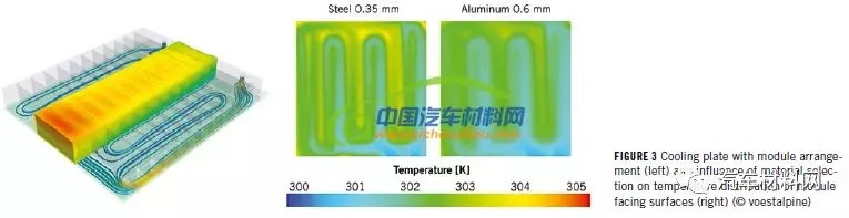 研究人员针对各种集成结构进行了性能模拟,其中,钢板材料以点状或线状形式焊接在一起,铝材通过结构形状设计辊压粘合。设计时,顶盖和底板的厚度、所得到的通道的宽度和深度、以及流道结构的均匀性设计都将是需要重点考虑的。因此,建立仿真模型对上述参数进行模拟测试。测试时,采用三个模块,每个模块由十二个棱柱形电池组组成,对其充电过程的热力学状态进行测试。图3为钢制壳体和铝制壳体的热学测试结果,如图可知,与铝相比,钢的低导热率对冷却系统的影响较小。而影响温度分布的重要因素为电池模块内的导热路径的设计,这可通过使用具有各向异性导热性能的石墨基导热箔来实现。