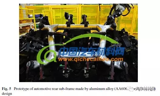 图5是基于CAE分析和重量优化设计后制成的铝合金副车架。相比于SAPH440钢制副车架的19.5kg,6061铝合金副车架重量为14.7kg,实现减重25%。同时,通过静态仿真和重量权重因子分析,是满足疲劳安全性要求的一个有效方式。