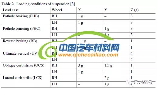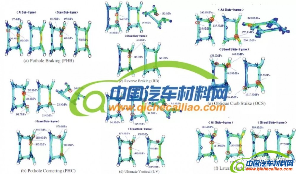 表3a-e显示了AA6061铝合金和SAPH440钢在PHB,PHC,RB,UV,OCS和LCS负载条件时考虑重量因子的副车架的最大应力和重量因子的结果对比。AA6061副车架的的重量系数低于SAPH440的重量系数,因此,铝合金替代设计的轻质副车架具有安全保障。从这些结果也可以看出,疲劳动态特性可以在部件的初始开发阶段通过使用简单的静态分析来验证和预测,而无需基于权重因子进行疲劳模拟。