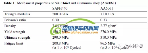 后副车架一般放置在轿车的后部下方,作为后轮和车身之间的连接。后轮通过连杆或臂连接到该部件,以确保悬挂的舒适。后副车架由前后横梁和两个侧梁以及6个支架组成,如图1。图2示出了副车架组装在整车上的模型及其连接点类型。表1为SAPH440钢材和6061铝合金的机械性能。