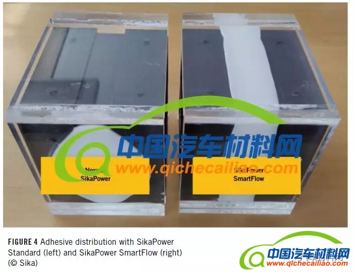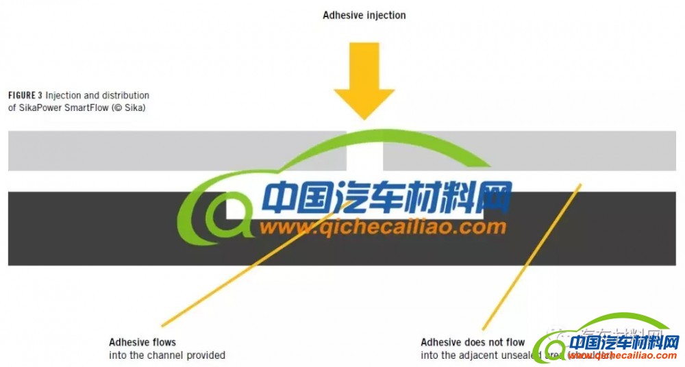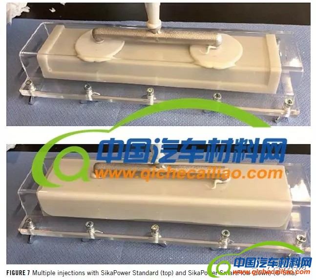 如果需要填充更大的通道或缩短填充时间,也可以同时在多个位置注入胶粘剂,如图7所示。该创新胶粘剂基于著名的SikaPower胶粘剂。因此,新粘合剂最重要的产品性能也与表2所示的已知系统相当。