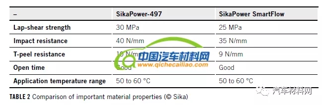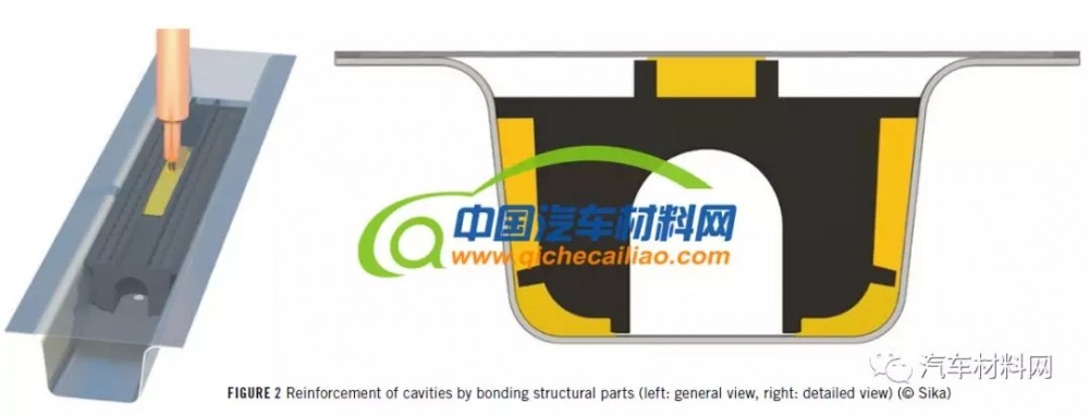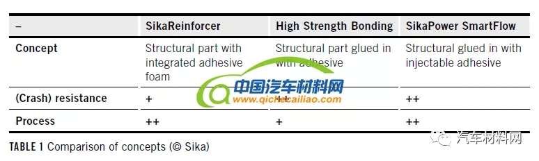 另一个应用领域是将塑料增强部件(如西卡玻璃纤维增强聚酰胺零件,商品名为Sika Reinforcer)粘合到车体中,如图2所示。将这些结构部件连接到车身有几个方案。可以将结构部件钩入体内。在热固化过程中,粘合剂泡沫会膨胀到金属,从而形成粘结。或者,也可以使用结构胶粘剂将这种结构部件直接粘合到空腔中,在西卡,此过程称为高强度粘结(High Strength Bonding ,HSB)。从机械角度来看,此过程具有诸多优势,详见见表1。