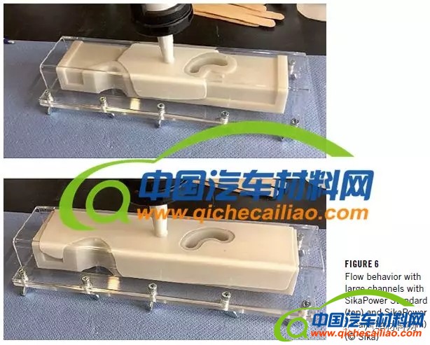 为了尽可能真实地测试胶粘剂的流动性能,开发人员建立了几个测试体,用所选的试件测试将加强件粘合到钢结构中的情况。之所以选择这种几何图形,主要是因为测试通道很大。相关的结构零件是使用3-D打印机生产的如图6所示。使用适当形状的有机玻璃外壳来代替金属结构,以最佳地跟踪流动行为。试验证实,大型通道可以被填补而不溢出的边缘和肩膀。研究还表明,此类部件的孔或凹处等典型元件不会对粘合剂的扩散造成问题。在这种情况下,胶粘剂会绕过障碍物流动,然后再次流到一起而不会留下任何气穴,如图6所示。