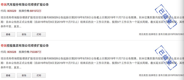 今日晚间,奇瑞汽车在长江产权交易所增资扩股的公告信息突然更新为“已结束”,这意味着已经有至少一家合格的投标人摘牌。