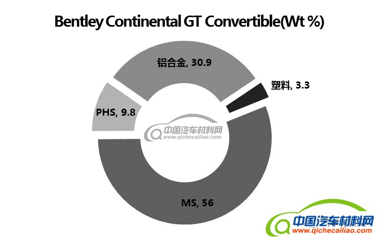 上图为 Bentley Continental GT Convertible的白车身用材情况,由图可知,Continental GT Convertible的白车身用材以钢-铝为主,其中传统软钢用量56%;热成形钢比例达到9.8%,车身的另一重要用材为铝合金,应用比列达到30.9%。