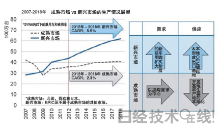 | 图2:全球汽车生产的增长转移到新兴市场国家 2012年到2018年的年均增长率方面,新兴市场为5.9 %,成熟市场仅为2.3%(摘自IHS Automotive的资料) |