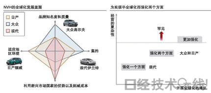 | 图3:日产、大众和现代的优势 日产在适应地区环境和降低成本方面发挥了优势,大众在品牌战略和经营资源的集约两个方面发挥了优势,而现代则致力于以成本竞争力优势为基础提高品牌号召力(图由本刊根据野村证券的资料制作)。 |