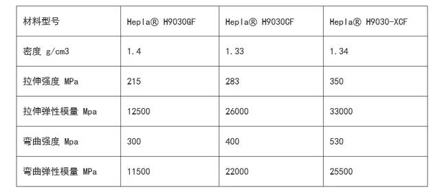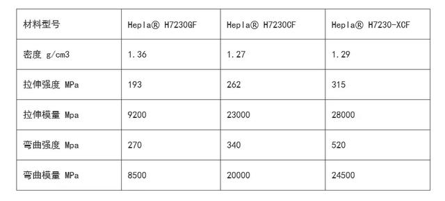 该产品具有优异的机械强度与抗冲击能力,尺寸稳定性高、翘曲低,材料性能较进口产品提升30%。以高温尼龙为基材的Hepla® H9000-XCF系列碳纤维复合材料,弯曲刚度超过52GPa,弯曲强度高达520MPa,拉伸强度达到360MPa;以PA66为基材的Hepla® H7200-XCF系列拉伸强度达到315MPa。 采用新产品生产的零部件比钢制零部件轻75%,比铝合金部件轻40%,可替代大部分金属,从而为汽车轻量化及其它行业“以塑代钢”提供更好的解决方案。