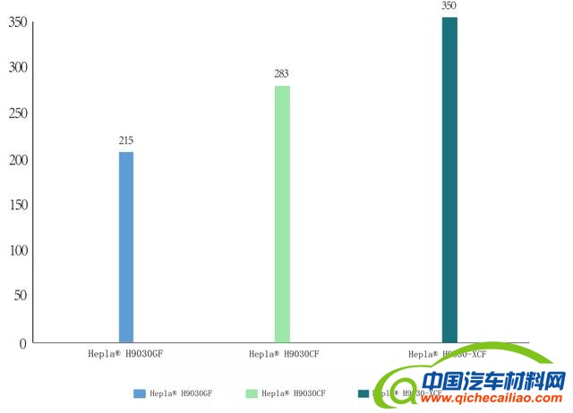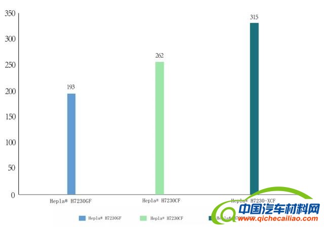 下图为Hepla® H7230-XCF(30%碳纤维)与Hepla® H7230CF (30%碳纤维)、Hepla® H7230GF(30%玻璃纤维)的拉伸强度对照图。