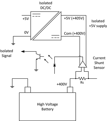 SMT 转换器的隔离等级为 5kVDC/1s(2.8kVAC/1min),爬电距离>4mm,可以连续承受输入和输出之间的高压电池的电压差。主要应用是给电动汽车电池管理系统的高压侧电流传感器供电(图 5)。传感器电路比系统接地高 400V 电池电压,而且需要一个 5V 隔离电源。