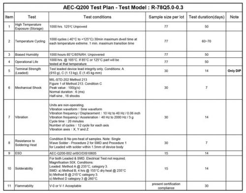 表 3:RECOM R-78Q5.0-0.3 的 AEC-Q200 测试计划
