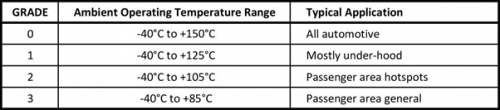 无源组件 AEC-Q200 和附件 001 至 007 涵盖了各种零件和测试方式。应用是以温度进行了分级(表 2)。请注意 0 级零件的温度为+150°C,比 AEC-Q100 制定的集成电路温度高了 10 度。