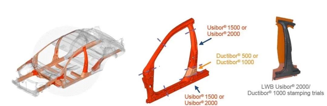 利用激光拼焊技术,将Usibor®与Ductibor®拼接后一次性冲压成形,可以实现额外的成本效益和轻量化解决方案。据介绍,在安赛乐米塔尔发布的中高级轿车与SUV车型S-in motion®白车身轻量化解决方案中,利用热成形钢和激光拼焊技术,可以在现有基础上实现高达26%的减重。由安赛乐米塔尔提供转让的不同热成形钢新材料及新工艺具有兼容性和一致性,能够确保满足材料使用的成本效益和性能高端要求。