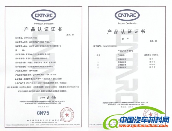 中汽研华诚认证中心是国家认监委指定的强制性产品认证机构,也是国内目前唯一具有“车规级CN95空滤”认证资格的权威机构。其中,C代表“Car”,N95代表对于≥0.3μm颗粒的过滤效率达到了95%,也就是达到“N95级”防护效果。CN95认证也是目前汽车空调滤清器的最高等级认证。