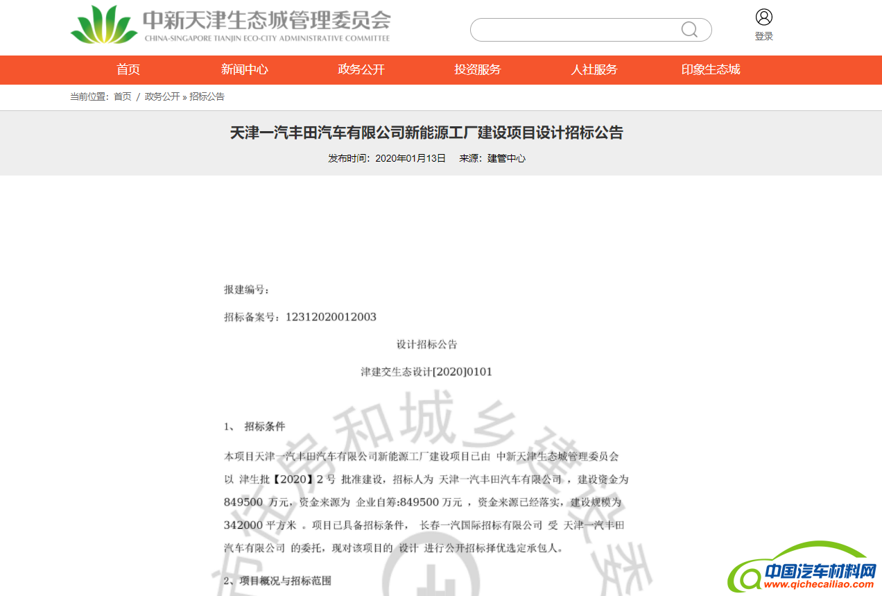 中新天津生态城管理委员会1月20日发布的《设计招标公告》显示,丰田汽车和一汽集团计划投资84.95亿元在天津滨海新区生态城新建一座新能源工厂,该工厂已被天津生态城管理委员会批准建设。总占地面积197万平方米,一期占地面积为97万平方米,建筑面积为34.2万平方米。