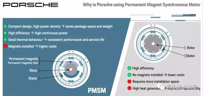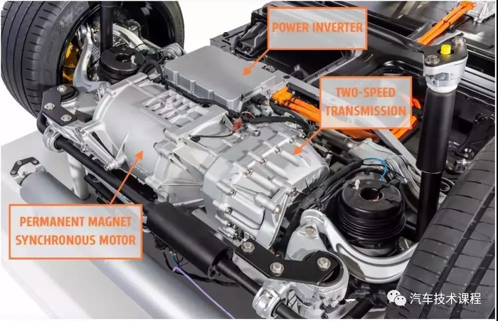 Taycan前后采用永磁同步电机,后电机动力更强提供449马力,406 lb-ft(550Nm,但turbor S能提供到450lb-ft - 610Nm),永磁同步电机相对于感应电机(tesla 采用感应电机)他的优势是高效(中低速更明显),体积小,更好的散热性能但价格相对高。