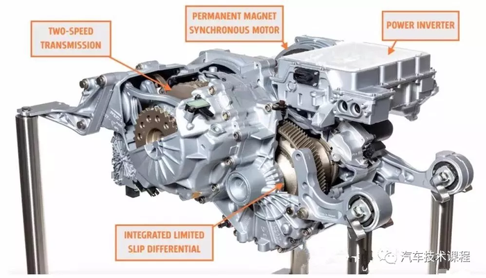 Taycan 的后桥集成了电机,变速箱,动力逆变器(600a) 整个外壳由铝浇筑而成大概170公斤。由于是双速所以他 有一个基于离合器的电子限滑差速器这是一个非常有意思的设计毕竟当前没有一家主流汽车采用双速离合器。