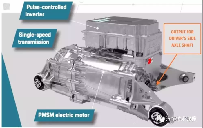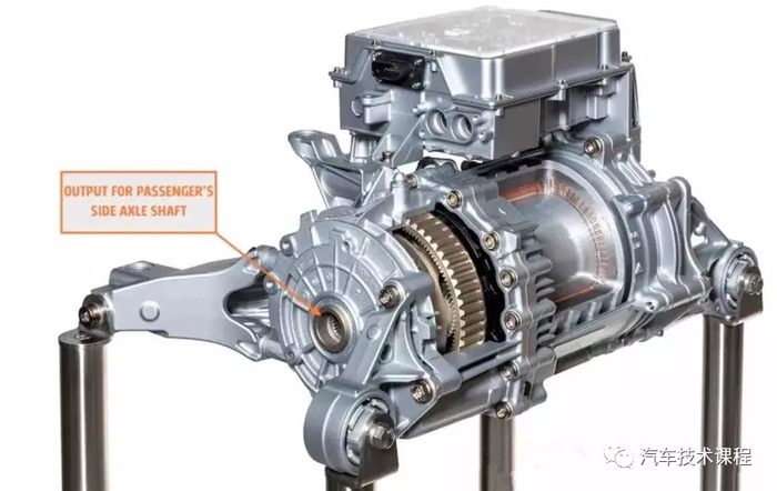 与捷豹i-Pace一样,单速前驱模块也同样吸引人,它采用了同轴变速器设计。变速器直接用螺栓固定在电机的端部,电机位于前轮之间的轴中心线上。事实上,其中一个前等速轴实际上通过电机转子的中心钩住变速器。