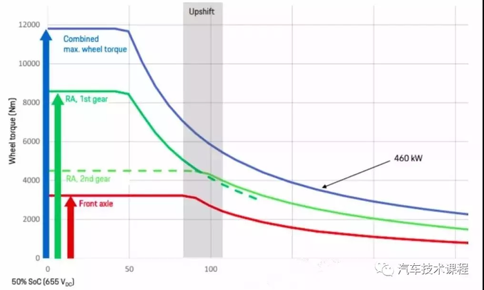既然Taycan 采用两档变速箱,那么最有意思的就是他们如何工作,分别优势是什么。通过下图轮边扭矩和速度关系图可以看出,在一档的情况下:在大概100km/h的时候一档的扭矩优势丧失,同时在130km/h的时候电机达到16000转的最大转速,这样的话对于高速加速很不利了;这个时候他标定为在100km/h的时候升入二档从而实现传输更多的扭矩来达到最优加速性能。