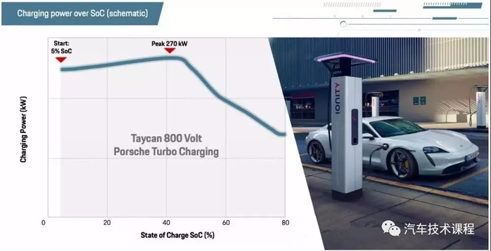 保时捷宣称22.5分钟之内让电池从5%冲到80%,最大充电功率为270kw,最大承受电流为334 安培,这个峰值大概发生在40%的SOC 时候。超过40%就需要限制充电功率保护电池。