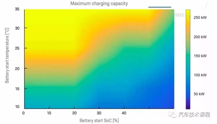 当然不止电池的SOC影响充电功率,气温同样影响,如上图所示电池最佳充电环境温度在25-35度之间,随着SOC的增加而下降。