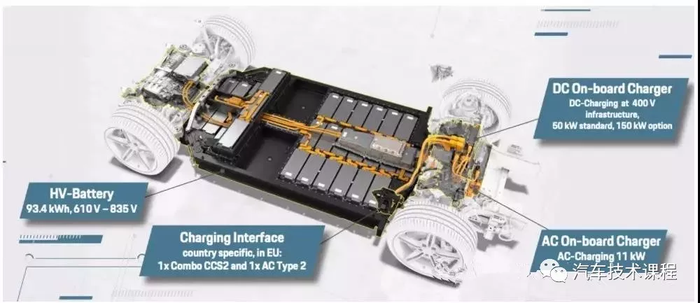 这样Taycan的电压实际介于610V(电池耗尽)到835V(电池满电)之间,标称723V,最大容量为93.4KWH,小于特斯拉MODEL S 的100KWH。