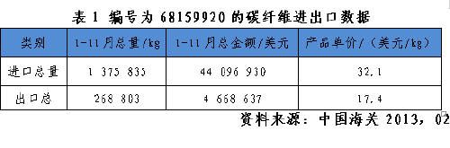 虽说国内的建成产能已经突破了10 000t,但实际产量仅为2 000t左右,产能利用率仅在0.2左右,而国际上大多数厂商的产能利用率为0.7~0.9。国内碳纤维生产线产能利用率低并不是因为下游市场需求不足,事实上我国每年都需要进口大量的碳纤维产品,包括海关商品编号为68151000的碳纤维布和棒,编号为68159920的碳纤维,以及编号为68159939的特种碳纤维纱线及其他制品等。仅以编号为68159920的碳纤维为例,2012年1-11月,我国的进口总量就达到了1 376t,而同期出口额仅为269t,如表1所示。